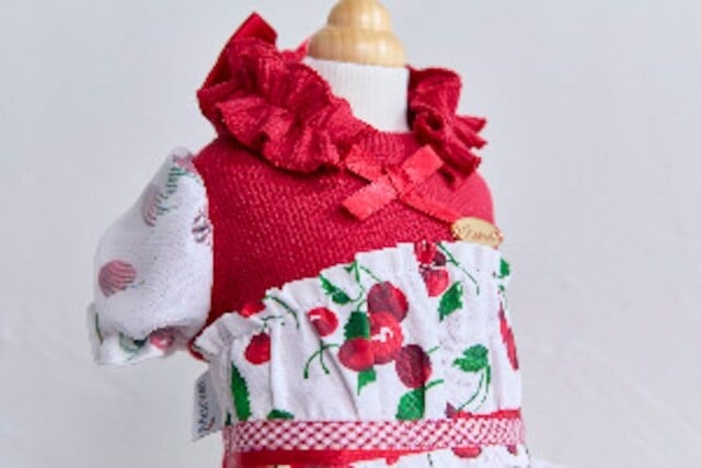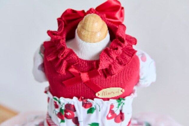 伸縮性の高いリブニット素材とチェリー生地を合わせた